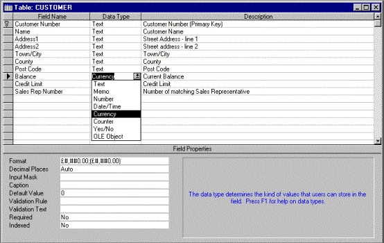 7.9. Use the techniques illustrated in paragraphs 7.4 to 7.8 to make the entries from the CUSTOMER table structure shown in figure 4. You will NOT need to click the Set Primary Key button for any of these fields. The additional fields are entered. A drop-down list of available data types displays in the Data Type column and use figure 4 to select the correct type. Notice that in figure 5, a custom format has been selected for the currency data types. If you press F1 when positioned on the Format field, Access will display context sensitive help on using formats.