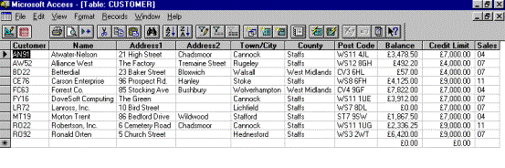 10.1. Point to the Open button in the Database window and click the left mouse button. Next click the maximise button in the Table: CUSTOMER window. The window contains the Datasheet view for the CUSTOMER table and the current record indicator is positioned on the first record. The status bar at the bottom of the window also indicates that the record is positioned on record 1.