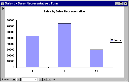 In addition to viewing the graph on the screen, you can also print the graph. Select the Sales by Sales Representative form from the Database window and click on Open. The graph should be displayed on screen, at which stage, click the Print Preview button. If the preview is OK, click the Print button to obtain a printed copy.